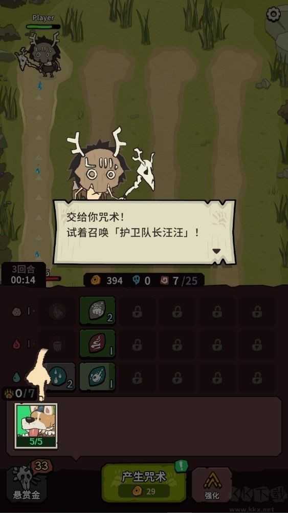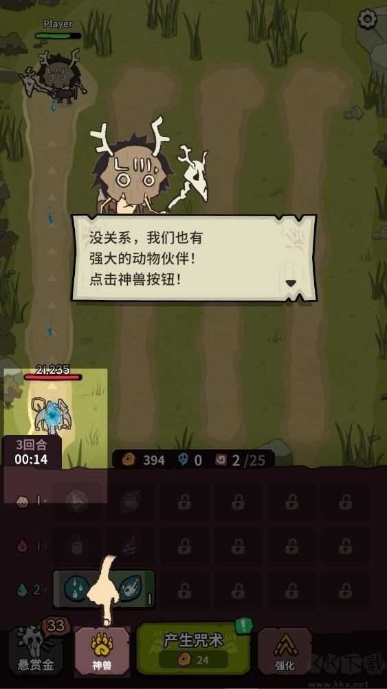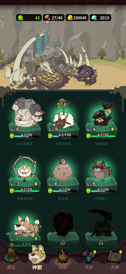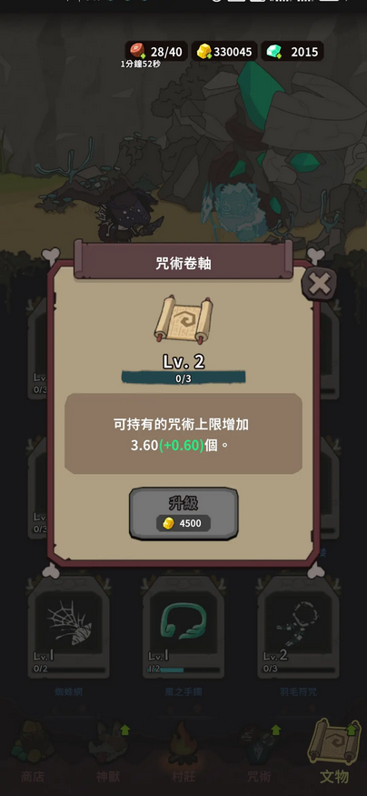 强化时先同步强化神兽等级(增加猫的灵魂产量以及仓鼠技能的爆发强度)和电系咒术等级。神兽等级强化至七级左右,电系咒术等级强满(约35波左右)后开始强化土系咒术。