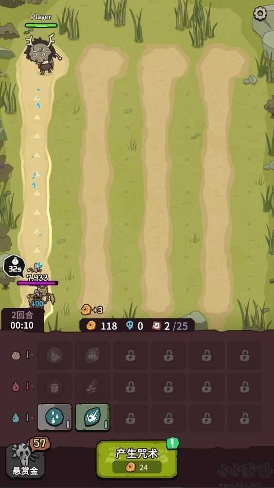 2、一条道配一座防御塔、防御塔通过产生咒术提升战力、强化防御;
