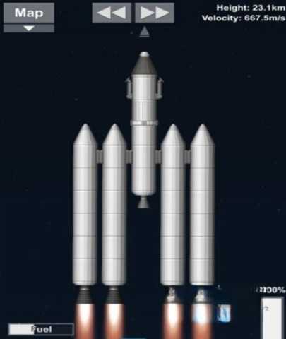 3、在起飞阶段,要同时点燃五个燃料反应器。这当中,处于中间位置的燃料反应器会最先耗尽燃料,一旦出现燃料耗尽的情况,必须立刻将其丢弃,通过这种方式来减轻火箭的重量。