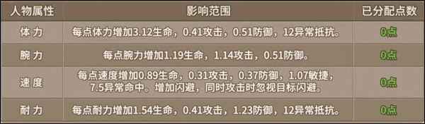 速度、耐力、腕力、体力等四个方面,每提升一点都可以获得对应的属性加成,但是各属性加成是不同的。比如玩家分配一点体力,可增加3.12生命值、0.41攻击力、0.51防御力、12异常抵抗属性。如果玩家分配到耐力上,可增加生命、攻击、防御、异常抵抗上。具体的加成属性如下,玩家可以作为加点参考: