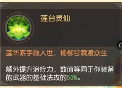 技能说明很清楚了,治疗增幅为武器的法攻的百分之五十,当辅助时尽量挑选比较高的武器装备就行