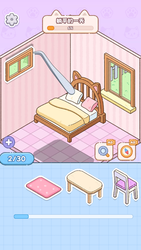 1、进入游戏后,拿起你的小镊子,把各种各样的家具和物品贴到它们该去的地方