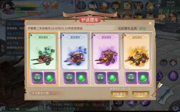 押镖可以获得大量的经验,可以通过消耗绑定元宝来刷新镖车,镖车等级越高获得的经验越高。每天16点~16点30分、21点15分~22点押镖的话可以获得双倍的经验奖励。