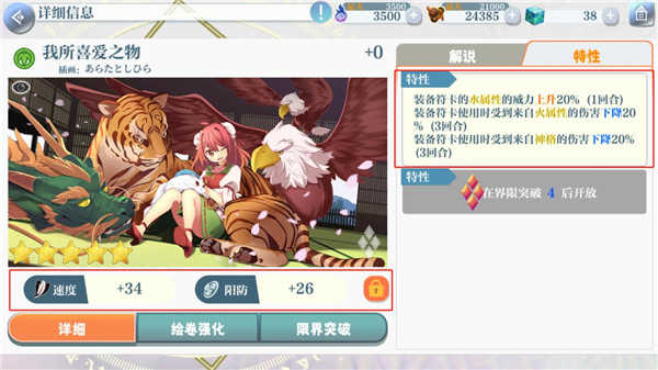 点开绘卷的特性之后我们就可以看到这里记录着这个绘卷所能带给符卡的属性加成,左边是基础属性,右边的特性是战斗中的特殊效果
