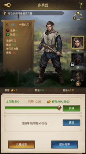 城防的建设对于进攻或防御有着至关重要的作用,现在你可以建造步兵营,训练步兵增强城市的军事实力。