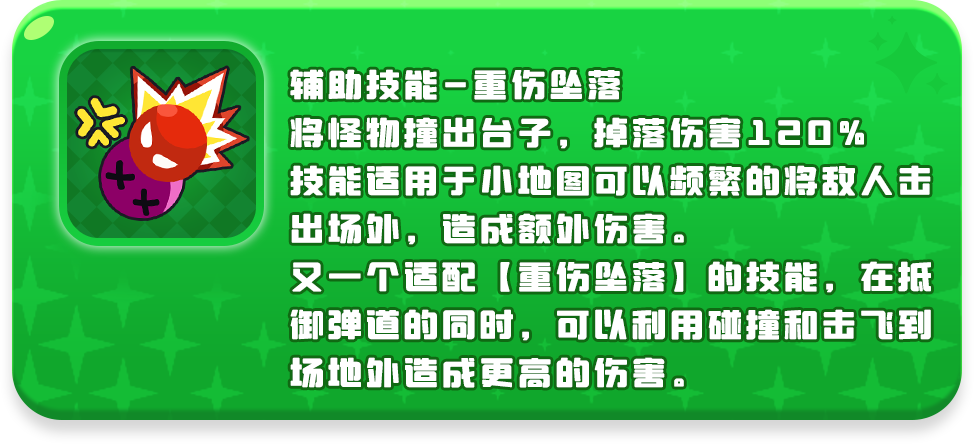 又一个适配【重伤坠落】的技能,在抵御弹道的同时,可以利用碰撞和击飞到场地外造成更高的伤害。