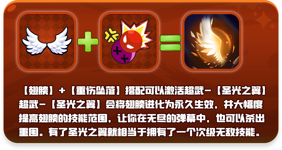 【翅膀】+【重伤坠落】搭配可以激活超武-【圣光之翼】,超武-【圣光之翼】会将翅膀进化为永久生效,并大幅度提高翅膀的技能范围,让你在无尽的弹幕中,也可以杀出重围。有了圣光之翼就相当于拥有了一个次级无敌技能。