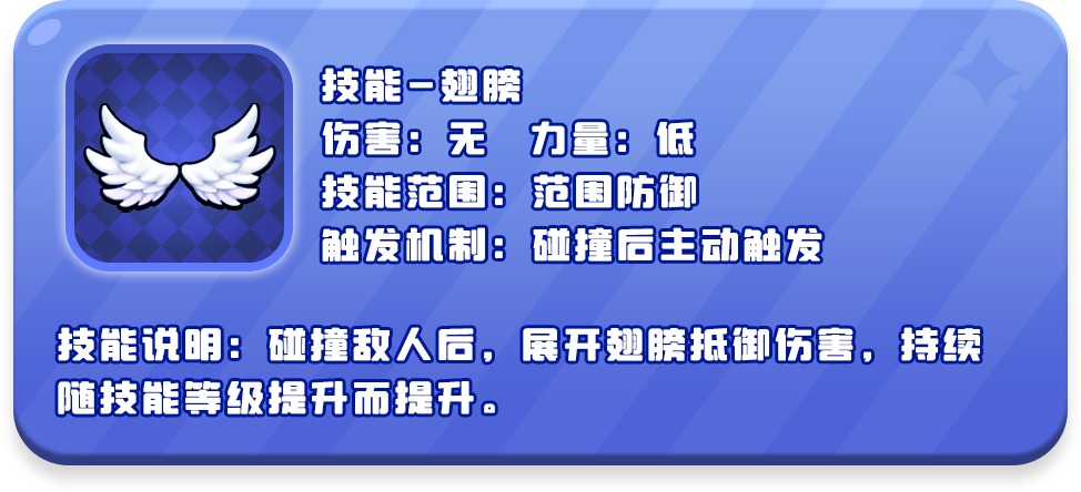 技能说明:碰撞敌人后,展开翅膀抵御伤害,持续随技能等级提升而提升。