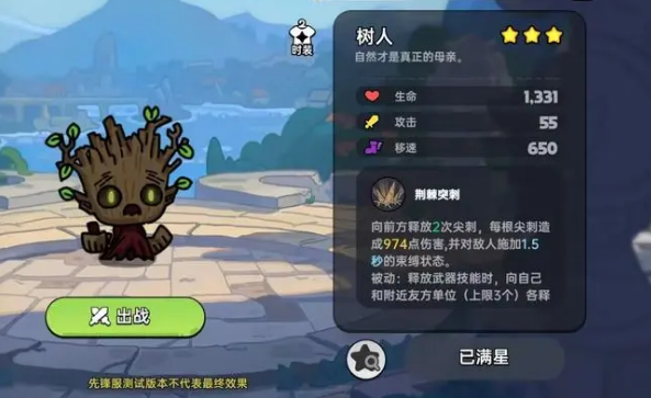 技能:荆棘突刺:向前方释放2次尖刺,每根造成974点伤害,束缚敌人1.5秒。