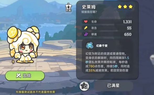 技能:幻象千变:幻变为附近的资源或普通怪物。变身状态解除时,向四周施加1.5秒混乱效果并释放粘液,每秒造成780点伤害,持续5秒,同时造成35%减速效果。若因受伤害解除变身,额外恢复15%生命值。