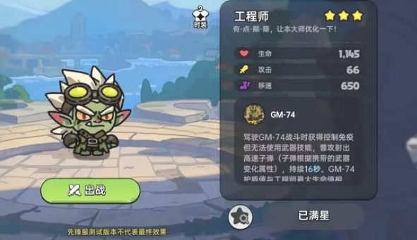 技能:GM-74:驾驶GM-74战斗时获得控制免疫但无法使用武器技能,普攻射出高速子弹(子弹根据携带武器变化属性),持续16秒。GM-74护盾值与工程师最大生命值相同,每0.4秒回复最大生命值1.5%的护盾,6点体力。GM-74损坏时工程师将逃离。