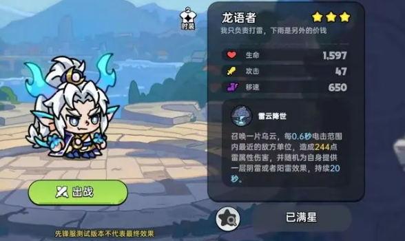 技能:雷云降世:召唤乌云,每0.6秒电击范围内最近敌方单位,造成244点雷属性伤害,随机提供阴雷或阳雷效果,持续20秒。