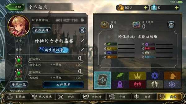 在这里你可以变更你的名称、称号、徽章以及旗帜。右侧为你的游戏段位以及游戏累计分数。下方为阶位对战:职业胜利场数。