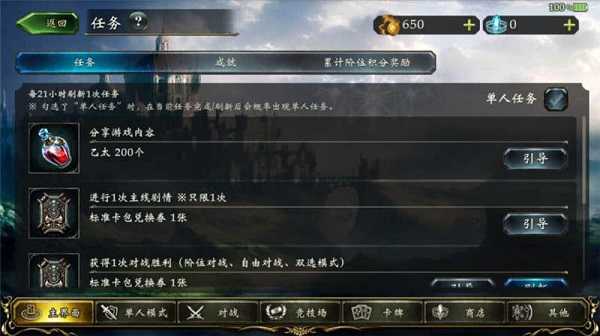 3、任务:任务、成就、累计阶位积分奖励。可以在此查看任务、个人成就和获得过的积分奖励。通常金币的积累是通过完成相对应的游戏任务获取的,当然氪金也可以获取游戏内相应的消费道具。