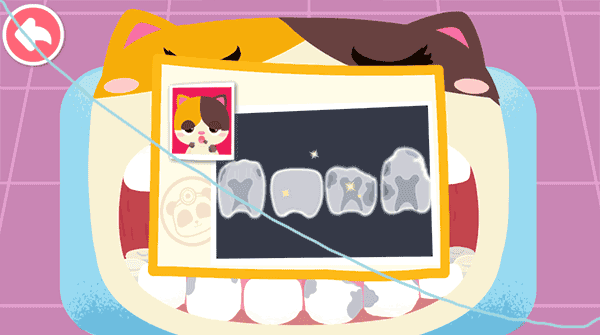 小猫不爱刷牙,牙齿上都是细菌,小牙医快来帮帮它,清理残渣,打开杀菌仪,消灭细菌,再喷上除臭剂。哇,小猫的牙齿变得又白又亮,记得要做好口腔清洁!
