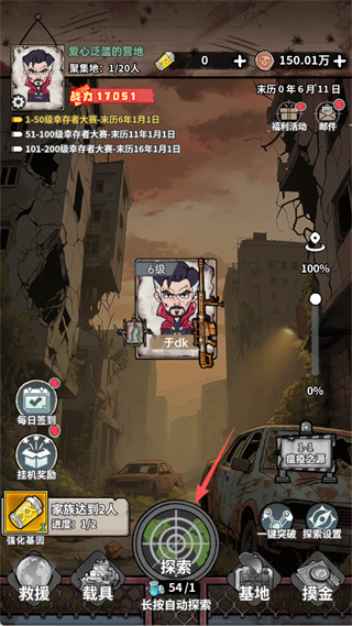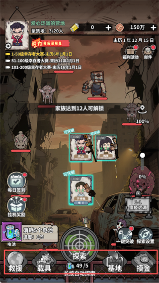 6、游戏底部设有【救援】【载具】等功能入口,需达到指定家族人数后逐步解锁。持续消耗电池推进探索,可不断提升战力,应对更强敌人。