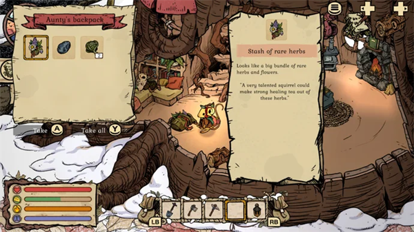 啮齿兽的稀有草药藏在你洞穴里阿姨的背包里。打开它,把里面的草药储藏品拿出来,转移到你的背包里(而不是你洞穴里的储藏室)。