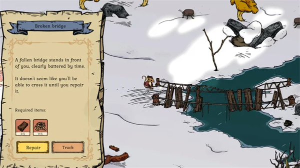 继续沿着叶子小径走,你就会到达断桥。你必须修好它才能找到另一边的阿姨。