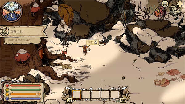 7、将工具装备起来,继续前往野外探索收集,当屏幕出现寒冰时,需要回洞穴取暖,等待数值没有会死亡!