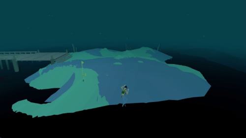 1、首个场景呈现出夜晚的水域环境,有一处平台与带有植被的岛屿,角色正处于岛屿区域,整体风格偏向低多边形的简约设计。