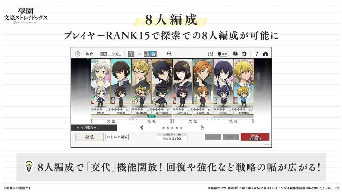 当玩家达到RANK15时,可组建的玩家人数将从4人增加到8人。 在8人阵型中,你可以指定一个起始或后到的角色,等待替换的角色可以恢复生命值。 高效轮流以获得战斗优势。