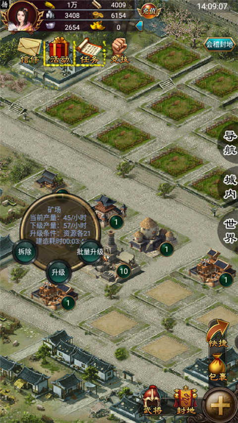 兵马未动,粮草先行,主公日后要征讨天下,资源尤为重要,资源可用来建设封地和招募士兵。封地内建设对应的建筑后就可以每时每刻生产出对应的资源了。
