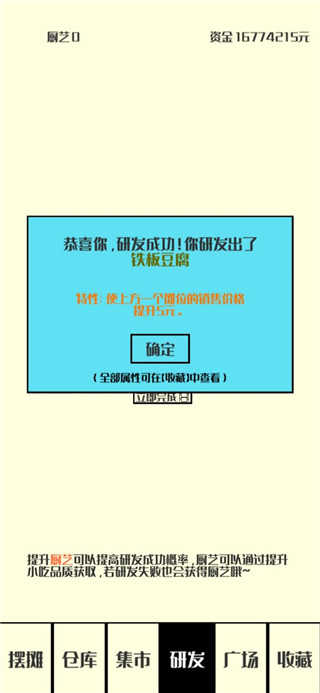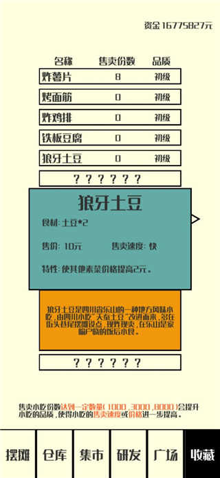 6、同时还可以研发新的食材;提升厨艺可提高研发成功概率,厨艺可以通过提升小吃品质获取,若研发夫败也会获得厨艺哦~
