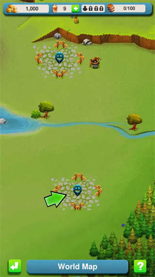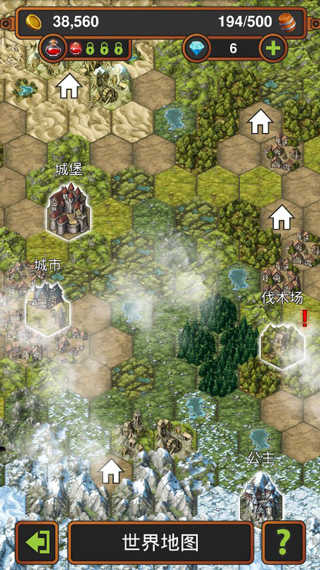 进入游戏,开启我们王国的发展征程。在游戏的世界地图里,能看到我们拥有的所有房产,白色房子图标代表可购置新地产,首先我们把伐木场作为首个建筑来购买。