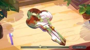 越过后,你可以按住Tab键查看哪些地方需要清理(高亮)。除了一个成就要求你在不使用提示系统的情况下100%清理物品外,你可以自由使用该成就(但在这个教程阶段你无法获得该成就)。当你通过所有教程后,就可以完成清理钥匙以完成关卡。每个物品有两个完成阶段,达到99%后,你可以点击“收尾”进入下一关。