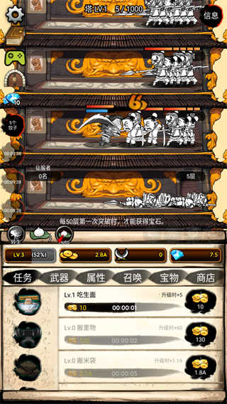 无限之塔是一部拥有丰富内容的作品,而且采用了诸多细腻且精美的画面,首先作品是一部RPG类型作品,玩家在作品中将要为你带来轻松且细腻的游戏玩法,而且作品中融入了大量的角色和内容,并为玩家提供非常优质的游戏打击感,而且整部作品的动画都将采用非常独特的唯美黑白卡通主题制作而成。游戏玩法一般,不停的冲塔,100层就转生,游戏砖石的话,每次过一塔都会得到一些,所以不担心砖石不够,只怕你不够肝,技能和雇佣兵需要砖石,雇佣兵有时间限制,到了就需要砖石从新召唤,没有副本,有比武。神器的话只有10个左右吧,不需要点点点,自动冲塔!中规中矩的放置游戏,尽快出新模式,副本等等。