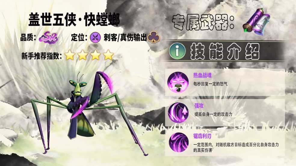 快螳螂虽然爆发力极强,但生存能力较弱,需依赖团队保护。其兼具真伤机制,实际强度远超当前品质,既是前中期PVP的利器,也是推进副本的关键角色。在前期关卡中堪称“后排杀手”,能有效克制高威胁目标。