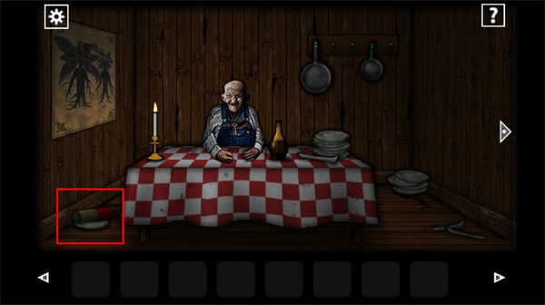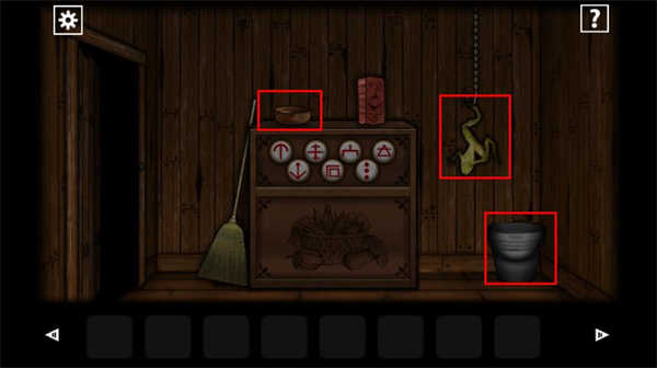 4、在这个房间当中,在桌上拿到木碗还有墙上的青蛙还有铁桶,可以查看桌面上的菜谱获得提示。