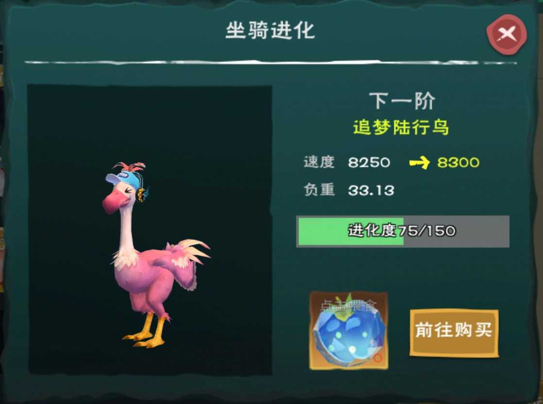 1阶可晋升为动感陆行鸟,进阶后速度为8250点,负重不变。