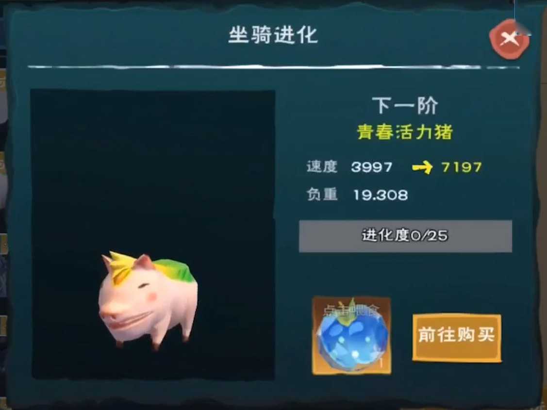 1阶可晋升为青春活力猪,进阶后速度=7100+(原速度-3900),负重不变。