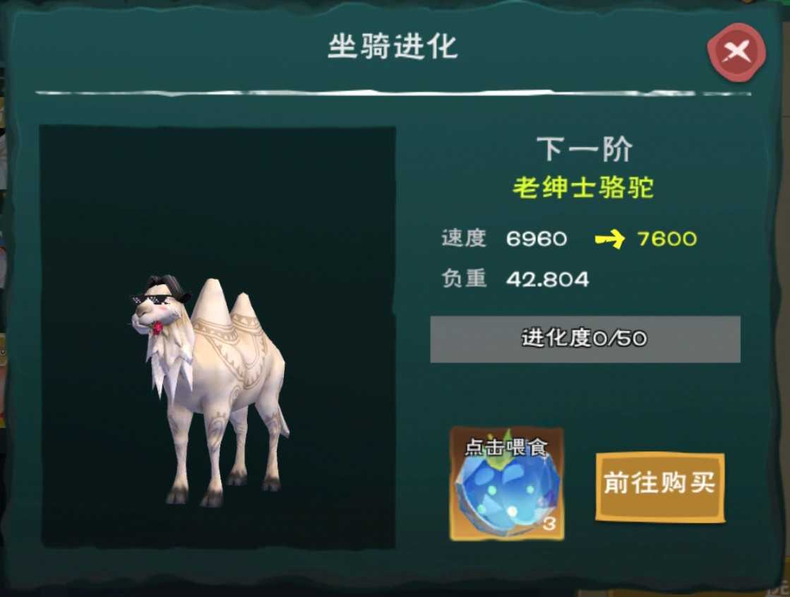 1阶可晋升为老绅士骆驼,7000速度以下进阶后速度为7600,7000以上则附加超出7000部分,最高7800,负重不变。