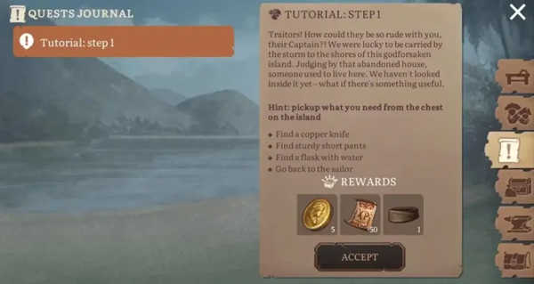 一开始,玩家在他们的出生岛上开始他们的旅程。一个破损的庇护所和一个船员可以接受任务。只需按照说明修理岛上的设施即可。目标很简单,例如修理花园床、集水器、篝火等。这些小而有用的设施将确保您的库存安全并存放您的物品。因此,请快速完成基本任务。
