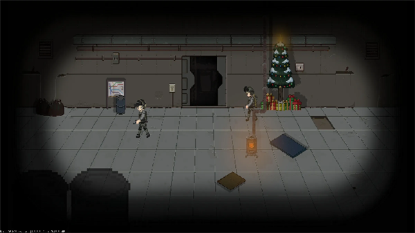 2.创建角色后,进入一个昏暗的室内场景,环境中有圣诞树、暖气炉和地图等细节,两名角色在房间中探索,营造出神秘而紧张的氛围。