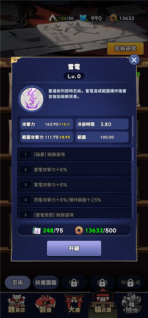 2、在每个阶段内,成功消灭指定数量的敌人即可触发忍术强化机会,玩家可选择解锁全新忍术,或对已有忍术进行进阶提升。