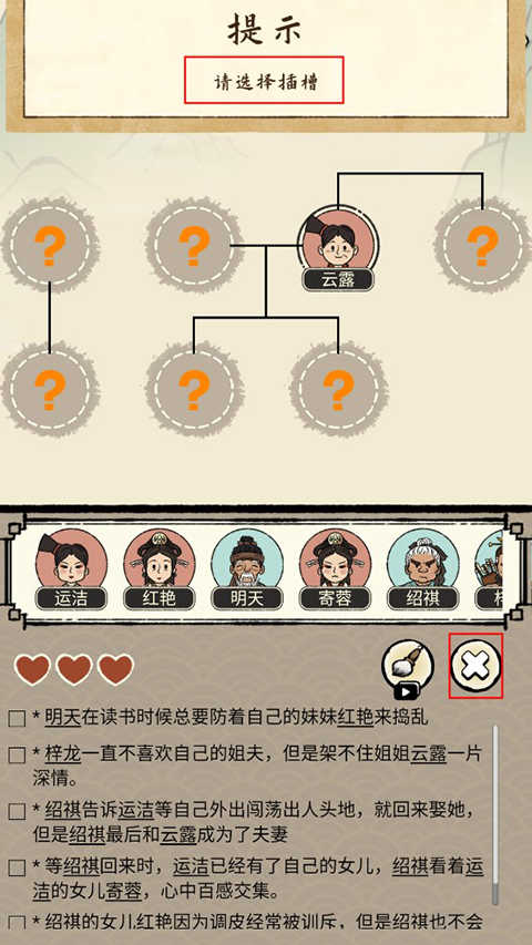 2、进入关卡后,玩家需要根据下方文字提示,将人物头像拖入上方合适圆框内,进行族谱的修缮。