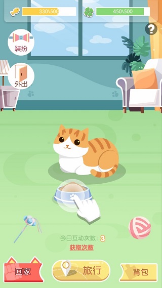 5、“回家”后可以撸猫,期间你可以选择外出,让宠物外出游玩,或者消耗钻石、服装碎片来为你的小猫咪打扮,当然记得喂养小猫咪,幸运值越高,猫咪外出游玩时带回来的东西越好哦~