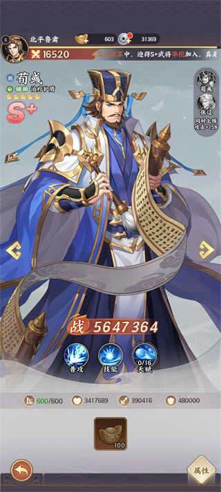2、荀彧(治疗型辅助|回血护盾)定向救援血量最低的3名队友,恢复116%攻击力的生命值,并附加40%自身攻击的护盾(持续3回合),续航稳定、容错率高,是中后期持久战的团队基石。