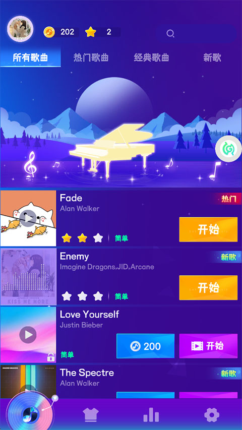 一心钢琴是一款受欢迎的音乐节奏游戏,让玩家通过触摸屏幕按时敲击下降的音符来演奏美妙的音乐。这款游戏结合了音乐、反应速度和手眼协调性,为玩家提供了一种独特而令人上瘾的游戏体验。在游戏内操作玩法极为简单,不需要玩家进行多复杂的思考和战术,只需要通过简单的点击屏幕即可实现全部操作,无论你是萌新还是音游大佬都可以快速掌握游戏技巧。