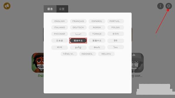 2、点击右上角的齿轮,可以切换语言,把游戏设置成简体中文。