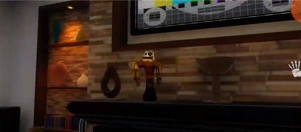 开始时,进入身后的第一个房间,也就是客厅,靠近右手边的玻璃窗,能看见两个没有头的塑料模特在动,然后消失。