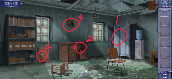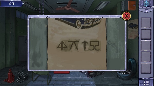 1、首先查看右边的墙壁上面的纸。发现奇怪的符号。实际上是几个对称数字组成的。数字为:4715,之后查看左边的柜子,进入密码的特写镜头,之后再次点击将它放大进行指针的摆放。