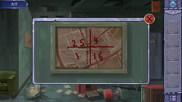 11、将残缺的画放置到墙壁上面的画框里面,之后如图所示发现上面的数字。25,4,3,16。按照图上面的数字顺序从1到6进行点击。成功之后门打开进入发电机室。