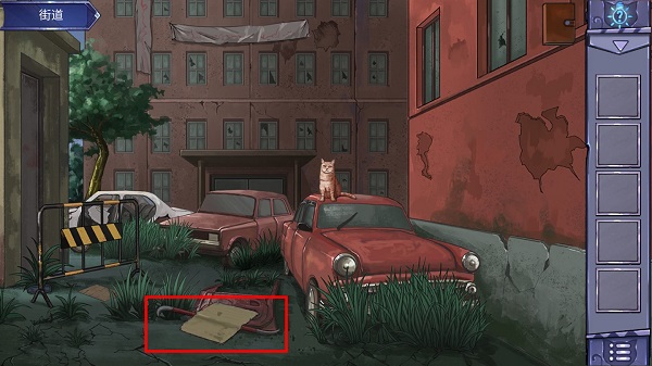5、点击所示位置的纸张以及撬棍。之后根据箭头的提示来到大楼前面。