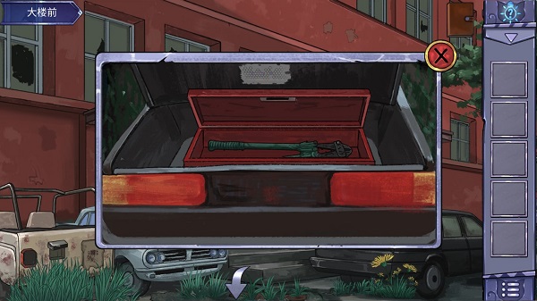 6、来到大楼前,使用刚才得到的撬棍将汽车的后备箱打开。查看车厢里面的贴纸,根据里面数字顺序依次查看它们的相临边。得出密码线索为4325。之后查看下面的密码箱。
