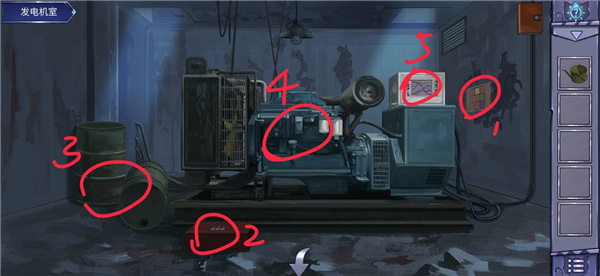 3、点击4,打开电源点击1,获取线索,将数字反向对称,只看左半边可得密码4715