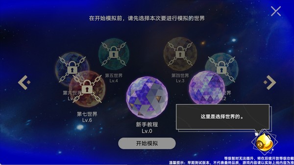 3、游戏内提供多个世界供玩家探索。前期建议选择第一世界进行游玩,新手玩家强烈推荐先完成新手教程,以熟悉基础机制。